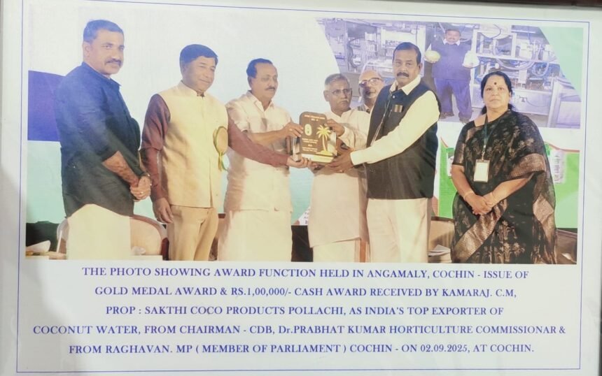 Angamaly, Cochin, Sept. 2, 2025 – Sakthi Coco Products, Pollachi, was recognized as India’s top exporter of coconut water at a prestigious award function held in Angamaly, Cochin. The ceremony, organized by the Coconut Development Board (Ministry of Agriculture & Farmers Welfare, Government of India), saw the presentation of the Gold Medal Award and a cash prize of ₹1,00,000 to Mr. Kamaraj C.M., Proprietor of Sakthi Coco Products.